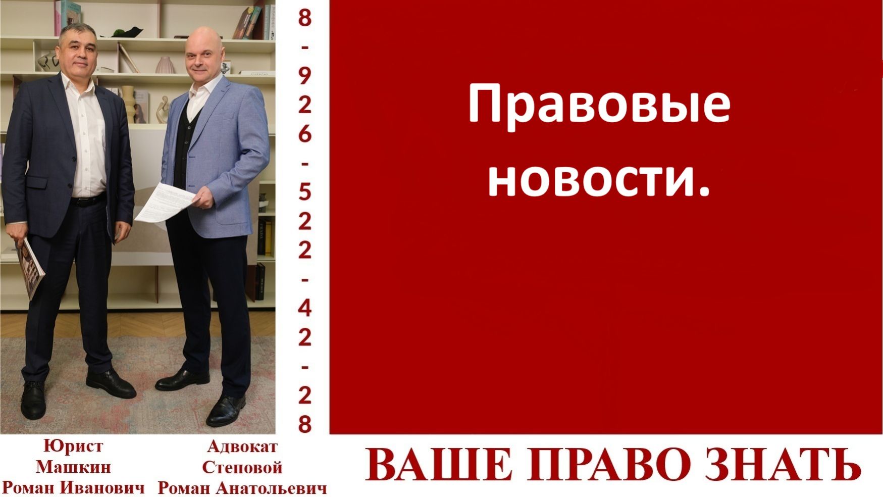 Обзор новостей законодательства от эксперта юриста Романа Ивановича Машкина. Телефон для консультаций +7-926-522-42-28 https://taplink.cc/md_rielt https://t.me/vashepravo_znat группа в Телеграмм для общения. Канал «Ваше право знать» создан для помощи гражданам в решении их юридических и не только вопросов. В форме кратких консультаций эксперты канала доступно рассказывают о возможных путях выхода из сложных правовых ситуаций. Основной целью канала является оказание аудитории юридических услуг и повышение правовой грамотности населения. Эксперты канала простым и понятным языком рассказывают о практической юриспруденции на конкретных примерах. Подписывайтесь на наш канал, обращайтесь с вопросами и за помощью. Мы найдем время для каждого. ЭКСПЕРТЫ: Машкин Роман Иванович, практикующий юрист со стажем 23 года, 2 Высших образования: Ставропольское ВАИУ (первые два года СВАУЛШ): штурманский факультет, Инженер по управлению воздушным движением. В 2000 году Военный Университет МО РФ, юрисконсультский факультет, юрист. Начальник юридической группы в МО РФ, Помощник начальника Управления по правовой работе-начальник правового управления в Управлении по использованию воздушного пространства РФ, генеральный директор и учредитель Юридической компании и Агентства Недвижимости «МД-Недвижимость», член совета директоров Холдинга «Моя Семья». Правовое сопровождение телевизионных проектов Дом-2, Суд Идет, Машина, Мама в Законе, международных телевизионных проектов. Являлся экспертом в телевизионных программах на телеканалах ТНТ, МИР, ТВЦ, участник круглых столов ТПП, Госдуме РФ, участник конференций, проводимых Минстроем России, член школы переговоров Игоря Рызова, состоит в деловом клубе Екатерины Уколовой. Правовое сопровождение компаний и ИП, представительство в Арбитражных судах и судах общей юрисдикции по вопросам налогового права, гражданского права, международного права. Банкротство юридических лиц. Семейное право. Сопровождение сделок с недвижимостью в РФ и за рубежом. Степовой Роман Анатольевич, адвокат, руководитель адвокатского кабинета. С 2002 года успешно осуществляет адвокатскую деятельность по представлению интересов и защите прав граждан и юридических лиц. С 2000 по 2019 года преподавал на юридическом факультете Московского государственного областного университета, (ныне Государственный университет просвещения), дисциплины гражданско-правового и государственно-правового профиля. Автор многочисленных публикаций по вопросам прикладной юриспруденции. В работе с клиентами придерживается принципов порядочности и профессионализма. В любой ситуации ищет оптимальную модель правового поведения и минимизирует потери клиента. Основную задачу видит в осуществлении реальной помощи доверителям и подзащитным. В общении с клиентами максимально честен. Майор юстиции запаса. Светлана, ведущая, студентка старших курсов ВУЗа, эксперт трудового права. Телефон для консультаций +7-926-522-42-28 Смотрите нас где удобно https://t.me/vashe_pravo_znat Телеграмм канал проекта "Ваше право знать." https://t.me/vashepravo_znat группа в Телеграмм для общения. https://www.youtube.com/@user-ki6nr6zh3p канал Ваше право знать на Ютюб https://rutube.ru/channel/30527736/ канал Ваше право знать на Рутюб https://vk.com/public219361576 сообщество во Вконтакте https://www.youtube.com/@user-zt2rt7vh1m канал Ютюб адвоката Романа Степового https://md-rielt.ru/ сайт МД-Недвижимость https://с