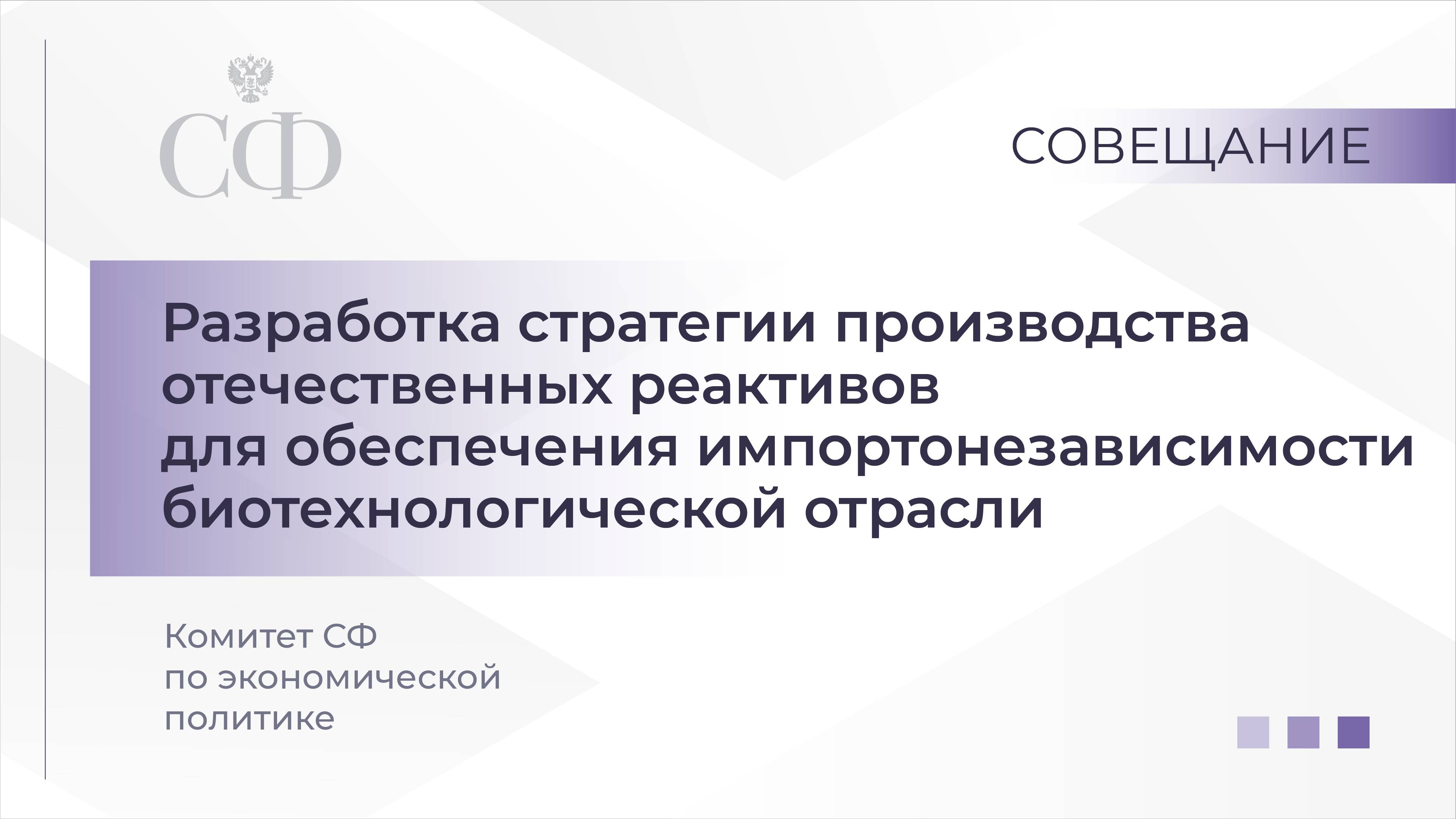 Комитет Совета Федерации по экономической политике проводит круглый стол на тему «Разработка стратегии производства отечественных реактивов для обеспечения импортонезависимости биотехнологической отрасли» К участию приглашены директор Департамента химической промышленности Министерства промышленности и торговли РФ Артур Смирнов, представители Министерства науки и высшего образования РФ, экспертного сообщества.