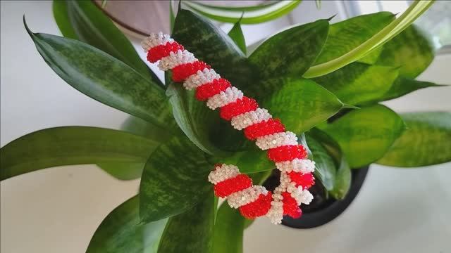 Карамельная палочка плетется мозаичным плетением, на видео использован чешский бисер белого и красного цветов. Далее палочка декорируется стразовыми лентами двух цветов, а между стразами проводим леску с японским бисером 15/0 размера. В итоге получается очень нарядный блестящий декор для дома или новогодней елки.