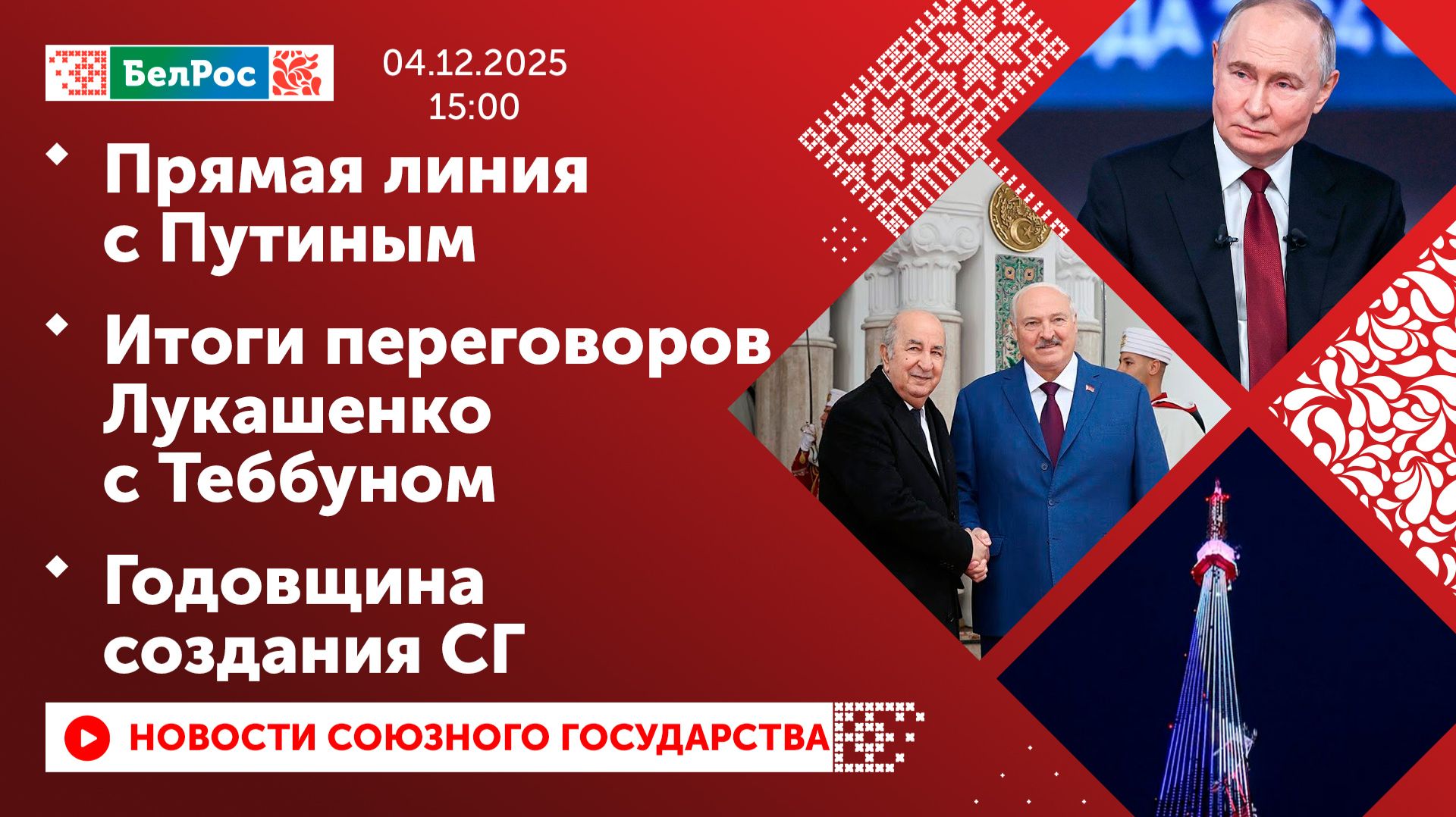 Закадровый текст озвучивает *ИИ Антон* Новости 04.12.2025 на 15:00 - Прямая линия и пресс-конференция с Президентом России пройдут 19 декабря. - Александр Лукашенко подвёл итоги переговоров с Президентом Алжира. - Телебашни в России 8 декабря включат особую подсветку в честь годовщины создания СГ. - Церемония возложения цветов к мемориалу советским воинам прошла в Берлине. Смотрите главные новости Союзного государства на телеканале БелРос. Ссылки на наши соц. сети Сайт: http://belros.tv/ Telegram: https://t.me/belrostv Одноклассники: https://ok.ru/group/55657426976918 ВКонтакте: https://vk.com/belrostv TikTok: https://www.tiktok.com/@belros_tv?_t=... RuTube: https://rutube.ru/channel/23501830/ Яндекс. Дзен: https://zen.yandex.ru/belrostvv Наши подкасты на Яндекс. Музыке: https://music.yandex.ru/album/25615251 #главныеновости #новостисегодня #СоюзноеГосударство