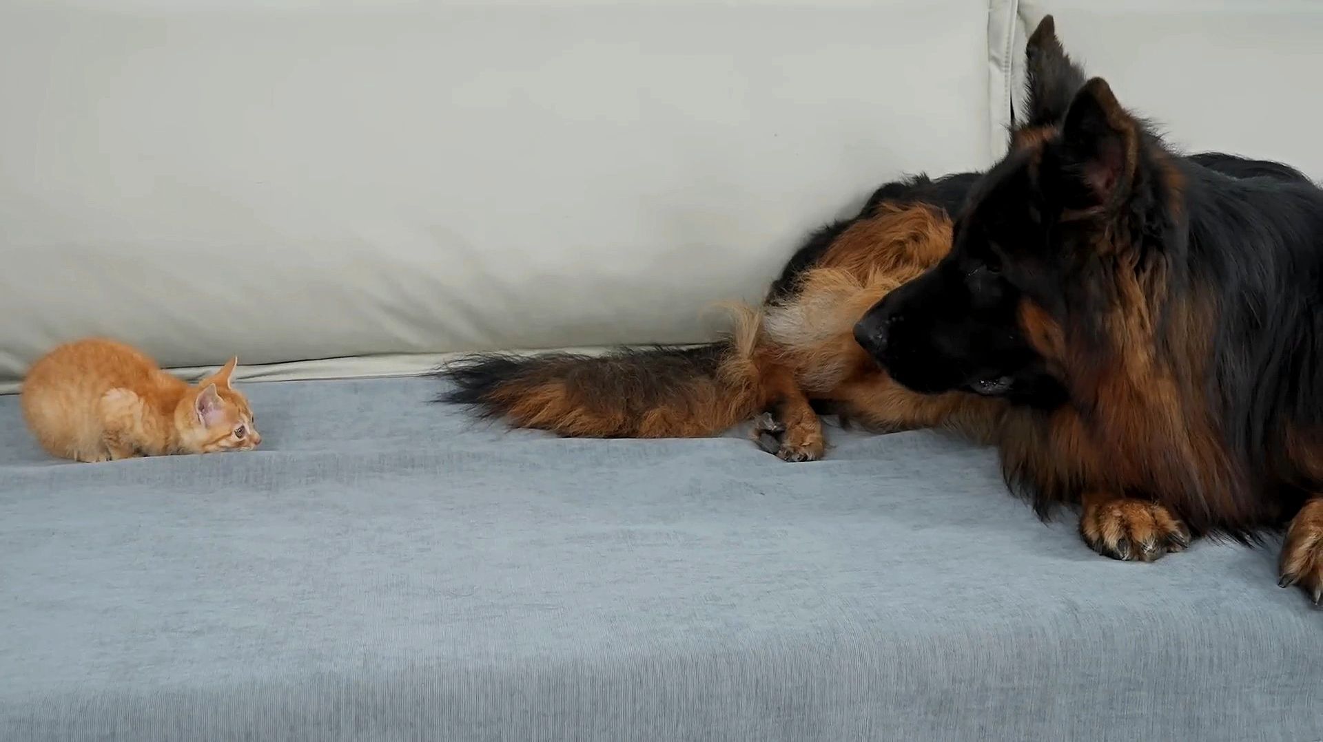 Немецкая овчарка подверглась нападению милого крошечного котёнка