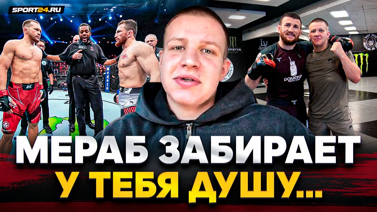 Марк Вологдин — молодой боец UFC из России, получивший контракт с лигой, выдав самое зрелищное выступление в истории Претендентской Серии Дэйны Уайта. Последние недели он помогал Мерабу Двалишвили готовиться к реваншу с Петром Яном. В этом интервью — впечатления Марка от спаррингов с грузинским чемпионом и расклады на бой Двалишвили vs Ян 2. Автор: Иван Ковалев. 0:00 "Это все мне удовольствие приносило, а про UFC думал: это далеко-далеко и нереально...". Вологдин вспоминает, как выступал в России 0:48 "Подумали с другом и решили остаться. Переехал полностью, все нравится". О жизни в Лас-Вегасе 1:40 "Америка и Россия — вот так хочется" 2:10 доводилось ли Вологдину пересекаться с Дэйной Уайтом в Вегасе? 2:35 как Вологдин стал одним из спарринг-партнеров Мераба Двалишвили в его подготовке к реваншу с Петром Яном 4:00 "Было ли ощущение, что спаррингуюсь с лучшим в мире? Да". / "Вначале все нормально, а потом он душу забирает у тебя..." 5:05 "Для меня это развитие". О пользе работы с Двалишвили 6:10 возможно ли что-то перенять от Мераба, учитывая, что он очень нестандартный боец? "Он неудобный, каменный..." / "Самое важное, что от него можно забрать — это его психология" 8:07 что бы делал Вологдин, если бы ему пришлось готовиться к бою против Двалишвили? 9:20 "Самый опасный? Петя очень опасен — особенно первый и второй раунд". Кто в легчайшем весе имеет больше шансов на победу над Двалишвили, по мнению Вологдина? 10:40 у кого больше шансов на победу над Мерабом — у Яна или Умара Нурмагомедова? / "Умар — очень техничный, очень! Но..." 11:40 станет ли для Двалишвили проблемой четвертая сгонка веса за 11 месяцев? 13:27 "Предельный возраст — поэтому он и дерется так часто. Думаю, год-два он еще будет всех выигрывать" 13:55 Двалишвили — величайший чемпион в истории легчайшего дивизиона UFC? 15:05 "Когда я его не знал, по-другому к нему относился. Но когда познакомился...". О Мерабе и его отношениях с Россией 17:55 что отвечает Вологдин, когда его спрашивают, за кого он будет болеть — за Яна или Двалишвили? 18:20 "Мераб — он фаворит" 18:38 "Очень быстро хотел вернуться, но меня останавливают". Вологдин — о дате своего возвращения 19:10 "Проснулся — даже голова не болела. Ноги болели и лицо сильно помято было...". О самочувствии после дикого боя на DWCS #Ян #Двалишвили #UFC