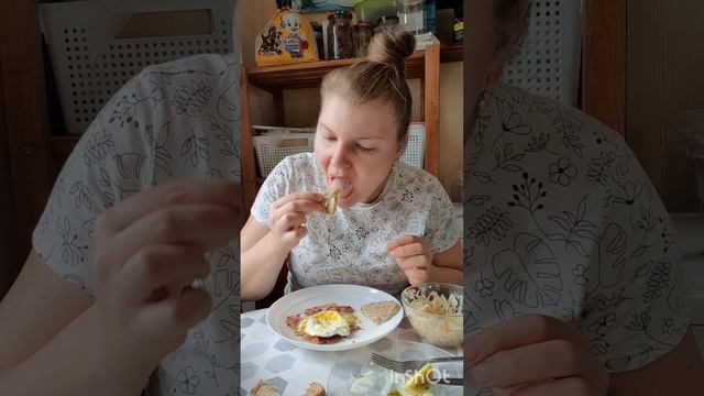 Мукбанг. Яичница с грудинкой, квашеная капуста, маринованные зеленые помидоры😋